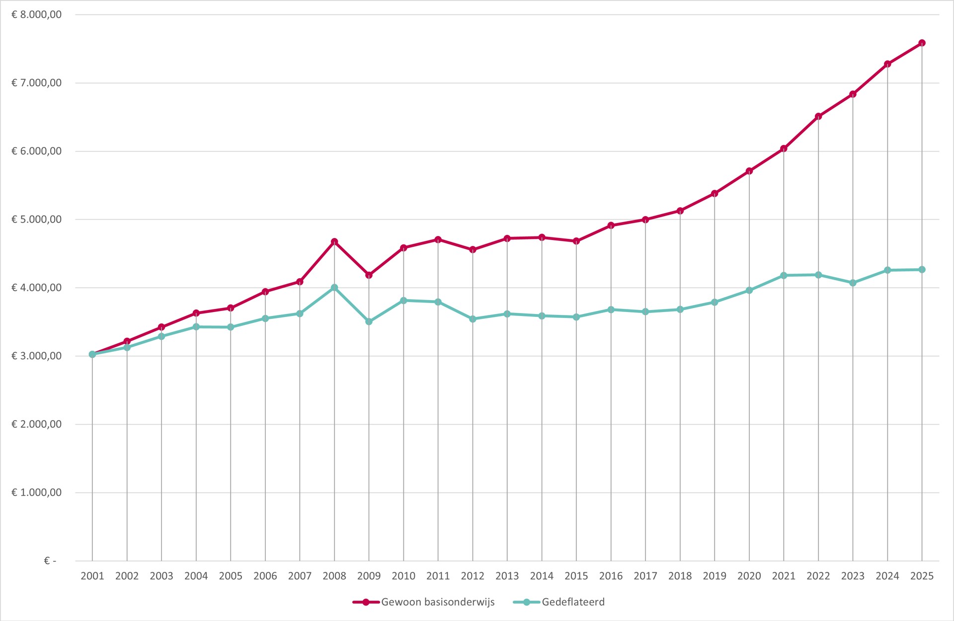 Een heel ander beeld ontstaat als we rekening houden met de inflatie, die de afgelopen jaren onder meer door de energiecrisis soms hoger was dan wenselijk voor een gezonde economie. Zonder inflatie, dus zonder rekening te houden met de index, kostte een leerling in het basisonderwijs in 2015 afgerond 3600 euro, en in 2025 iets meer dan 4250 euro. Nog altijd een stijging, maar al een pak minder spectaculair. Een leerling in het gewoon secundair onderwijs kostte zonder inflatie ongeveer 6500 euro in 2015 en bijna 6650 in 2025. Er is over tien jaar gemeten dus nauwelijks een verschil in de werkelijke kostprijs per leerling in het secundair onderwijs. In een grafiek gegoten is de curve bijna vlak.