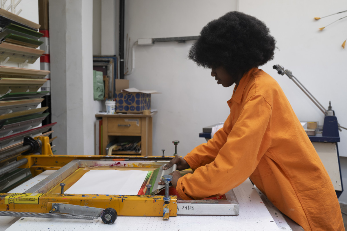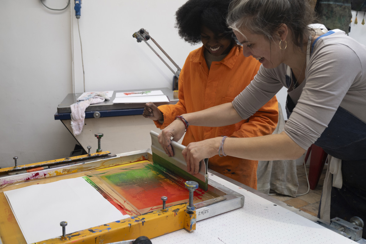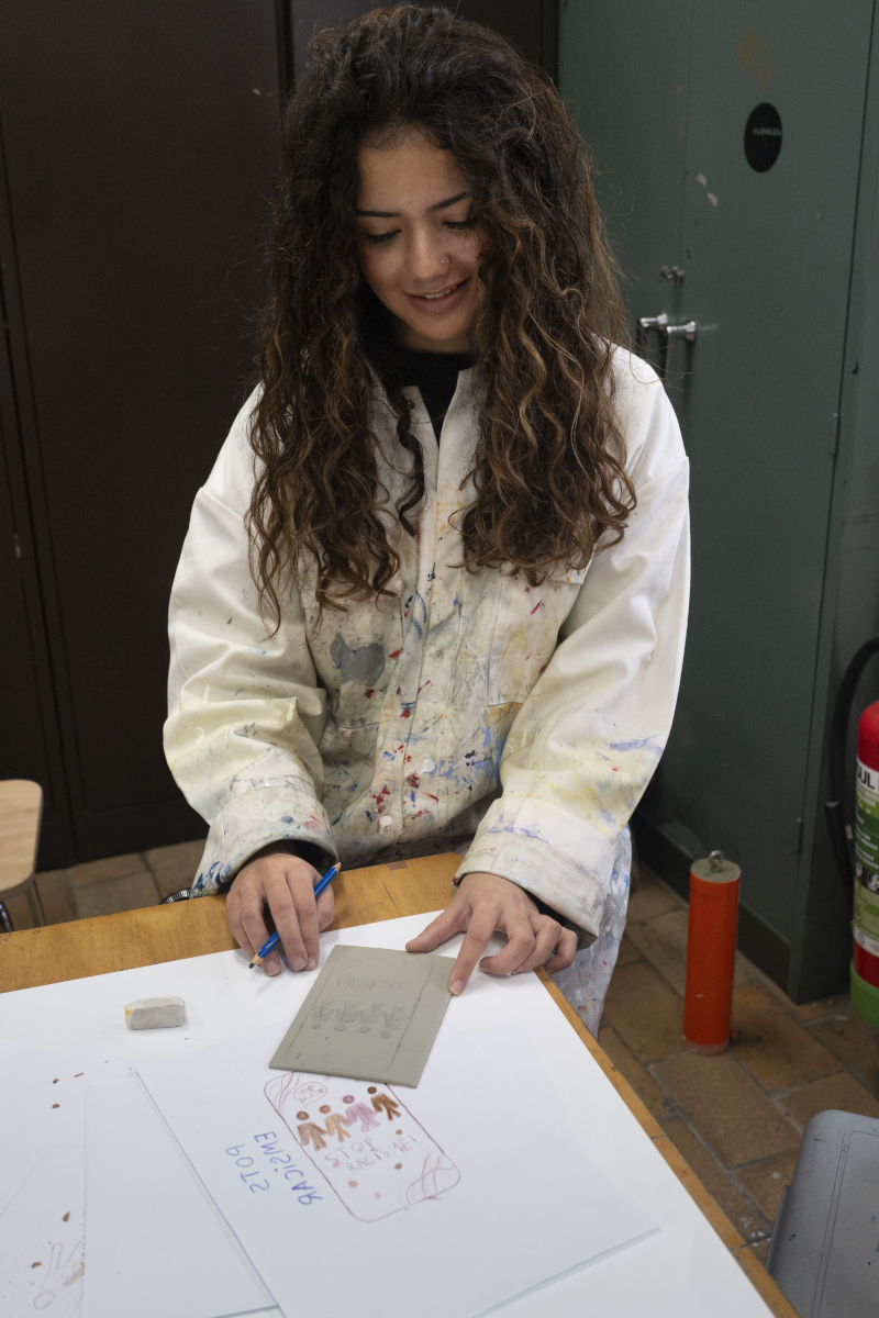 Dit schooljaar werkt Jessica met het zesde jaar rond zeefdruk. Isabelle: "Jessica bracht zeefdruk naar de klas. Nu werken leerlingen aan hun eigen ontwerpen die ze straks in het atelier van RHoK Academie tot leven brengen.”