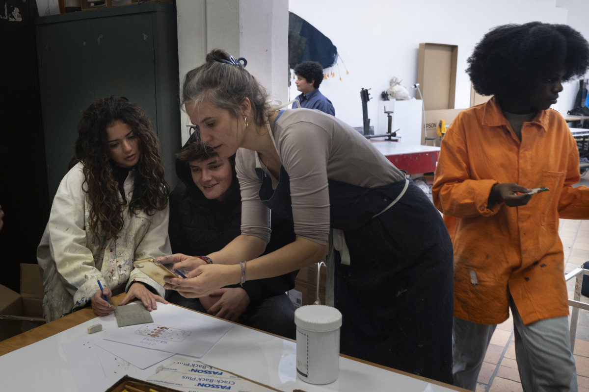 Isabelle Vanassche, leerkracht Kunst & Cultuur en Visuele Vormgeving op GO! meertalig atheneum Woluwe: "Onze school heeft een FLEX-werking waarbij verschillende vakken samenwerken. Dat wil zeggen dat elke leerkracht — van geschiedenis tot aardrijkskunde of OKAN — Jessica kan aanspreken om rond een thema iets creatiefs uit te werken."
