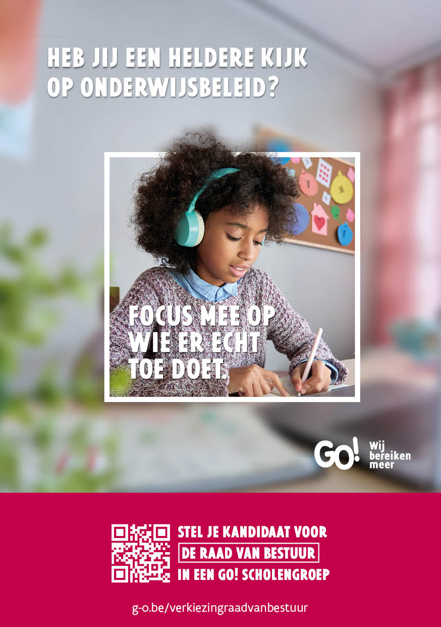 In alle 26 GO! scholengroepen wordt een nieuwe raad van bestuur verkozen. GO! communicatie ontwikkelde campagnemateriaal om de verkiezing breed te promoten. Er zijn zowel materialen voor sociale media als voor print. Alles is makkelijk deelbaar op je eigen kanalen.